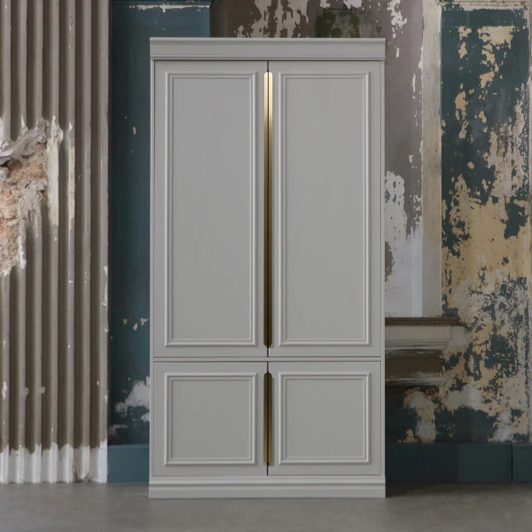 In de BePure Organize serie vind je behalve deze bergkast met legplanken ook een diepe garderobekast, waarbij je kunt kiezen uit compartimenten of een roede voor hangkleding. De mist grijze kasten zijn gemaakt van massief grenen met een geschuurde afwerking, waarop het antiek koper prachtig uitkomt.