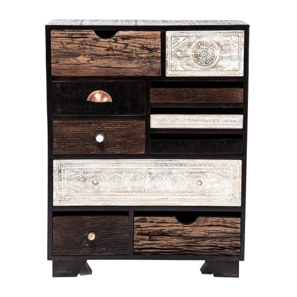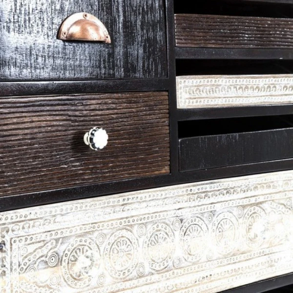 De Kare Design Finca 10D ladekast zit boordevol sfeer en karakter. In het frame van donker mangohout komen de lichtere lades prachtig uit, en als je dichterbij komt kun je genieten van het unieke houtsnijwerk- met de hand vervaardigd. Het dressoir heeft 10 lades en een omvang van 70 bij 90 centimeter: leuk in de woonkamer, in de hal of bij je werkplek!