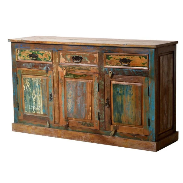 Dit bijzondere dressoir is gemaakt van sloophout van oude, Indiase vissersboten voor een echte authentieke look. Het veelkleurige hout is met de hand bewerkt tot een stijlvol meubel: elk exemplaar is volledig uniek, met een eigen karakter en verhaal.