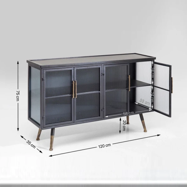 In dit Kare Design Gomera dressoir heb je een bescheiden zicht op je serviesgoed: dankzij de deuren van ribbelglas zie je nog net de contouren en kleuren. Met een breedte van 120 centimeter en vier hoge deuren biedt het dressoir flink wat plaats aan je servies! Bijzonder aan het dressoir is de mix van zwart gepoedercoat staal, ribbelglas en messing. Voor een retro look in huis.
