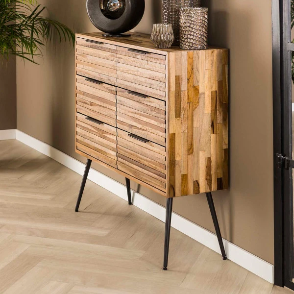 Deze eigentijdse ladekast heeft 6 lades om al die losse rommeltjes in op te bergen die anders je woonkamer ongezellig maken. Of gebruik de ladekast voor ondergoed, sokken en hemdjes in de slaapkamer! Waar je de ladekast ook neerzet, het meubel brengt veel sfeer naar je woonruimte. Dat komt door de warme en natuurlijke uitstraling van het teakhout; maar ook omdat het speels is ingelegd in stroken.