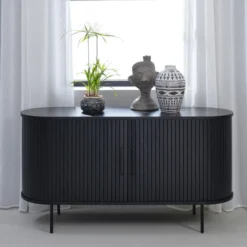 Dit houten dressoir van zwart eiken heeft twee schuifdeuren die je naar wens een stukje open kunt zetten. Dus verberg aan de ene kant van het dressoir je administratie, en vul de andere helft met boeken en gezellige decoraties! Met een breedte van 140 centimeter kun je er heel wat spulletjes in kwijt. De ronde vormen, hoge poten en speelse stroken in het hout geven het dressoir een retro uitstraling.