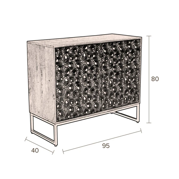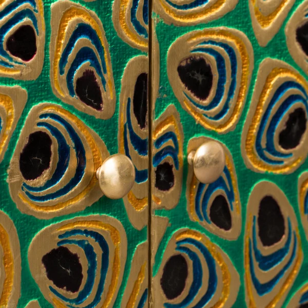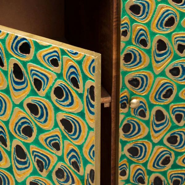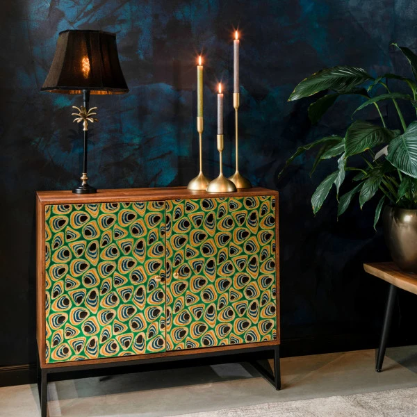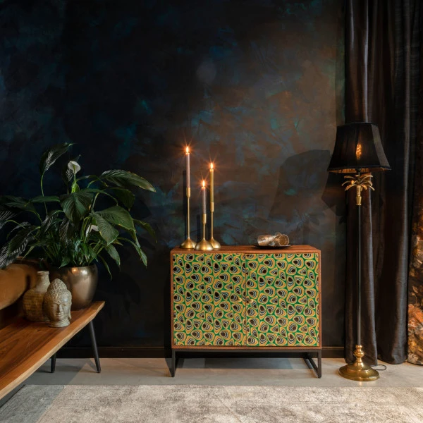 Het kleurrijk Dutchbone Meena dressoir is in staat om van een saaie woonkamer een ruimte met karakter en sfeer te maken! De deuren van mangohout dragen een bijzonder pauwenpatroon met verschillende kleuren – zelfs messing vind je erin terug. Ook het reliëf in het mangohout geeft het dressoir karakter. Een unieke blikvanger in je interieur!