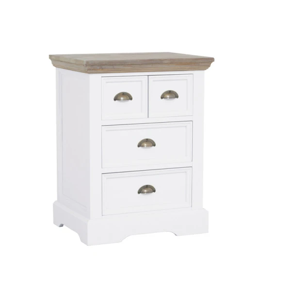 Voor deze Tower Living Fleur ladekast van hout heb je altijd wel een plekje in huis. De ladekast reikt 73 centimeter hoog en kan daarom ook dienen als bijzettafel naast de bank, of gebruik de ladekast als basis voor een mooie groene plant in de hoek van de woonkamer! In de 4 lades kun je post, waxinelichtjes of opladers bewaren. Een landelijke sfeermaker met een functionele kant.
