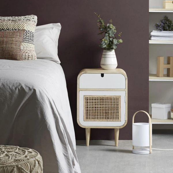 Met dit Kave Home Georg nachtkastje van 40×60 centimeter naast het bed krijgt je slaapkamer een gezellige uitstraling. Het mango houten frame zorgt voor sfeer, maar heeft dankzij de strakke lijnen en afgeronde hoeken ook een rustig effect op je slaapomgeving. Berg crèmes, oordopjes en je telefoon netjes weg in de lade van het nachtkastje; voor een leesboek en tijdschriften is plaats achter de rieten deur.