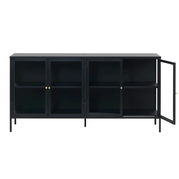 In dit zwart metalen dressoir komen de kleurrijke kaften van je boeken extra mooi uit! Of gebruik het dressoir voor je beste serviesgoed. Met een breedte van 170 centimeter en 4 glazen deuren biedt het dressoir veel opbergruimte. Bovenop kun je ook nog wat spulletjes zetten, zoals een wijnkaraf met glazen of een verzameling kunst. Een strak dressoir voor in een modern industrieel interieur.