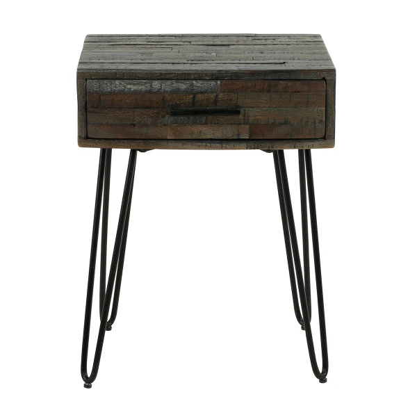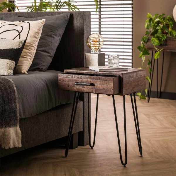 Een compact nachtkastje dat toch veel sfeer brengt. Dat komt door de stroken van ingelegd hout boordevol kleur en karakter! De greywash afwerking zorgt voor een industriële look, die mooi samengaat met het metalen onderstel en de handgreep. Tijdschriften, nachtcrèmes, oordopjes en je telefoon kunnen mooi in de lade. Bovenop is plaats voor een gezellige leeslamp en je boek.