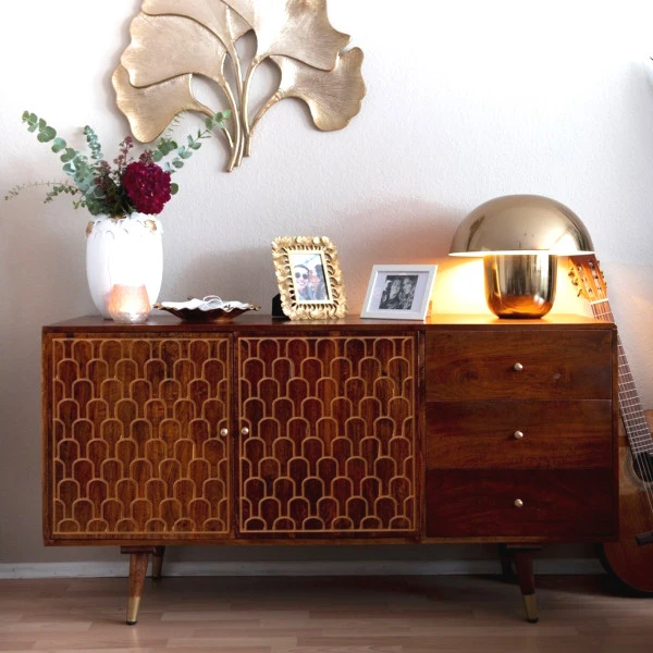 Haal een uniek meubel bomvol karakter in huis! Ieder exemplaar uit de Muskat serie is met de hand geproduceerd. Dit is terug te zien aan de charmante imperfecties die zich onthullen wanneer het meubel van dichtbij bekeken wordt. Het met de hand ingezaagde patroon, de gouden verf die voor extra elegantie zorgt en de tekeningen op het mangohout zijn allemaal unieke elementen die dit dressoir tot een one-of-a-kind meubelstuk maken.