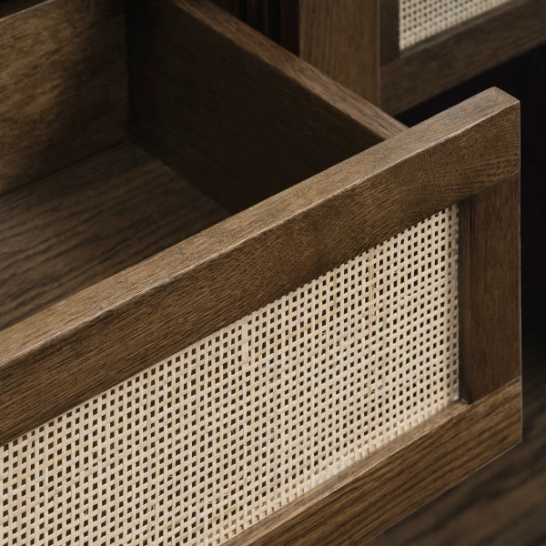- Achter de schuifdeuren bevinden zich 2 lades met rotan en 6 open vakken
