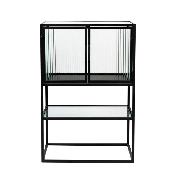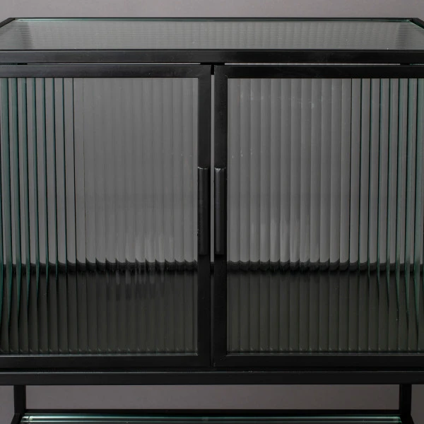Je herkent de Dutchbone Boli serie aan de mix van zwart metaal en ribbelglas. Behalve deze compacte vitrinekast vind je in de serie ook een hoge wandkast, een ribbelglas dressoir en een klein wandkastje. Of zoek je nog een bijpassende salontafel?