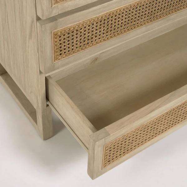 De Kave Home Rexit ladekast heeft sfeervolle elementen van rotan webbing, met de hand gevlochten voor een uniek karakter. Tegelijkertijd zorgt de basis van mindihout voor veel rust. Zet de ladekast op de slaapkamer en gebruik voor ondergoed, sokken en hemden. Of geef de rotan webbing ladekast een mooie plek in de woonkamer: de vier lades zijn ideaal voor losse rommeltjes!