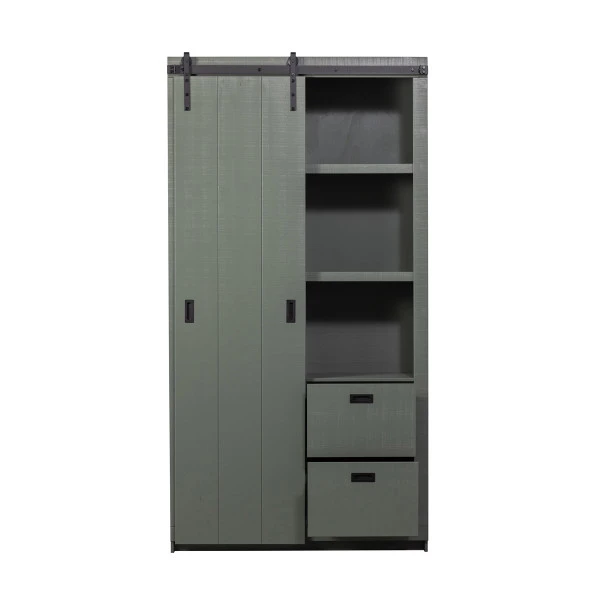 Bij de VTwonen Barn schuifdeurkast heb je keuze uit twee kleurvarianten: betonlook of grijsgroen. Welke past het beste in jouw interieur? De schuifdeurkast is ingedeeld met 6 open vakken, vier laden en een deur die je naar wens kunt verplaatsen. Zo creëer je elke keer een ander aanzicht! Twee kasten naast elkaar staan extra leuk wanneer je de deur elk aan een andere kant zet.