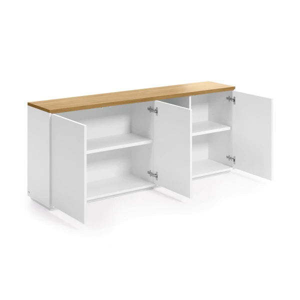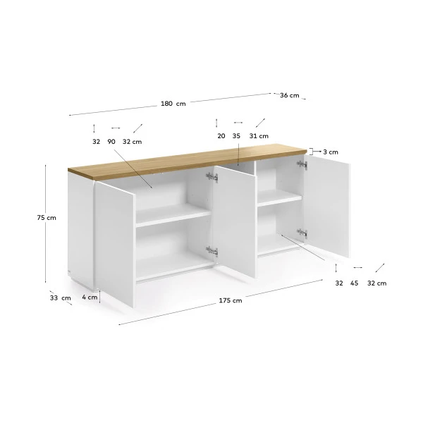 Het Kave Home Abilen dressoir heeft een heerlijk rustig design: strakke lijnen en lichte kleuren. De ombouw van wit gelakt MDF geeft een moderne basis, terwijl het eiken blad voor sfeer en een Scandinavisch tintje zorgt. Zet je mooiste wijnglazen of decoraties in de open vakken en berg alledaags serviesgoed of administratie netjes weg achter de deuren van het dressoir!