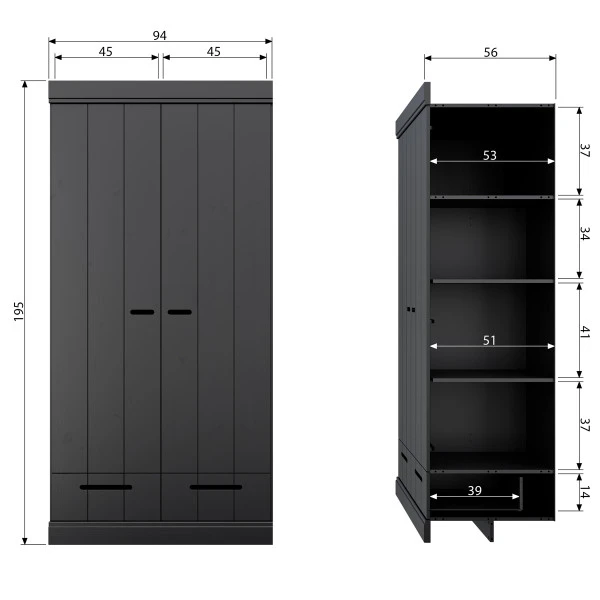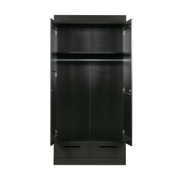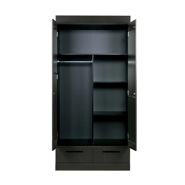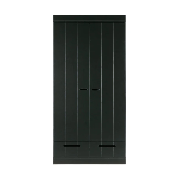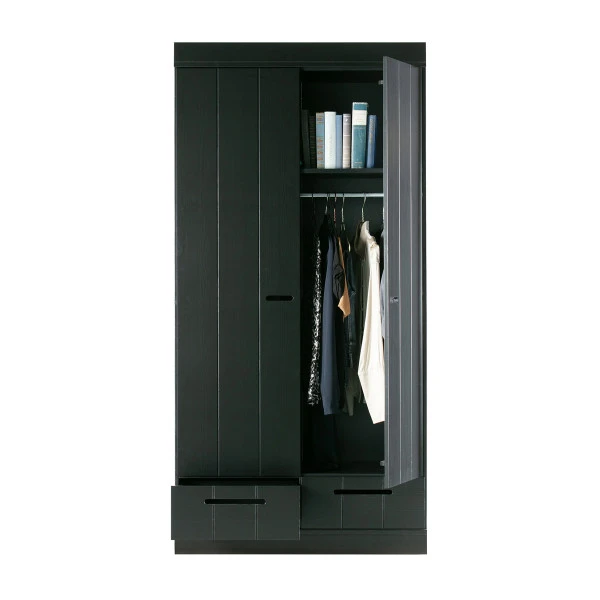 Bijzonder aan deze Woood Connect kledingkast is de mix van landelijk, modern en stoer industrieel. De landelijke look overheerst, maar de 2-deurs kledingkast heeft ook details van een lockerkast! Bovendien heb je keuze uit verschillende interieurs: met een breed hanggedeelte, of juist met extra legplanken. Twee lades maken de zwarte kledingkast compleet.