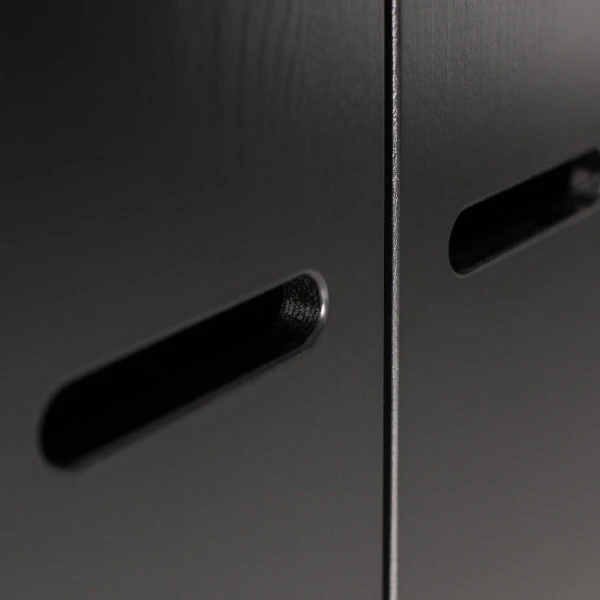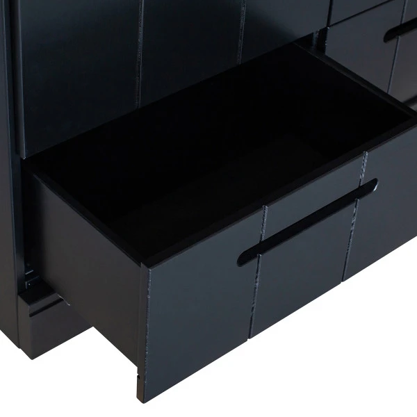 - Zwarte kledingkast met strokendeuren en lades